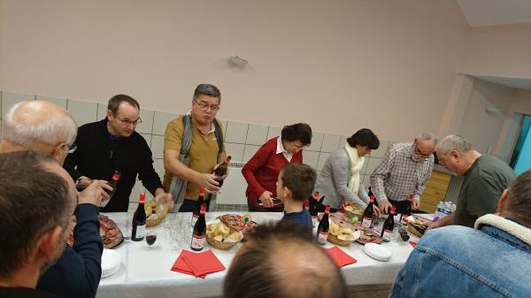 Vendredi soir, une soixantaine de personnes ont répondu à l'invitation pour déguster le beaujolais nouveau mais aussi charcutaille. En fait ce n'est pas tellement le vin en lui même qui attire mais son coté festif. Le beaujolais nouveau c'est surtout une occasion de sortir entre amis et de faire une petite fête avant 'hiver.